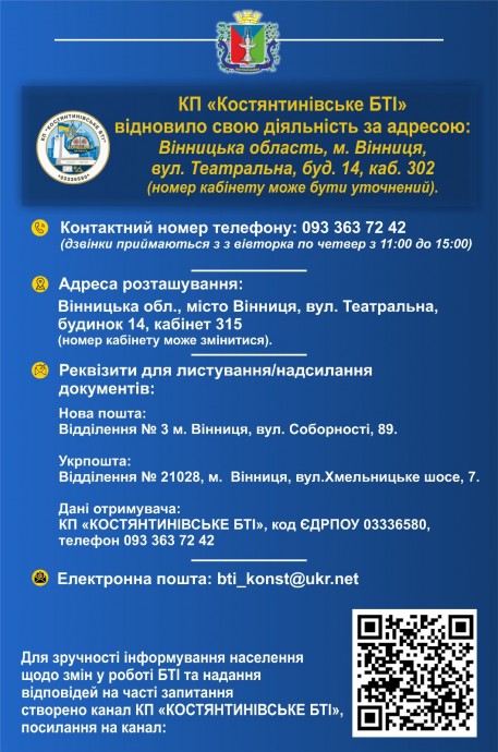 За повідомленням Костянтинівської міської військової адміністрації, у роботі КП «Костянтинівське БТІ» відбулися важливі зміни, які стосуються адреси, контактів та порядку подання заяв.