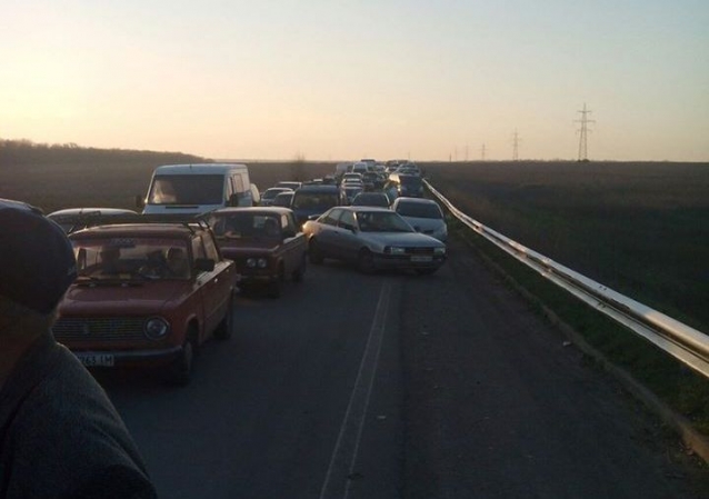 КПВВ Марьинка в направлении Курахово очередь около двух километров, движение слабое. В направлении Донецка - около километра, движение есть.