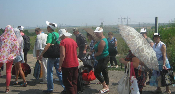 На Новотроицке в Донецк машин почти нет, а вот пешая очередь - человек 200.