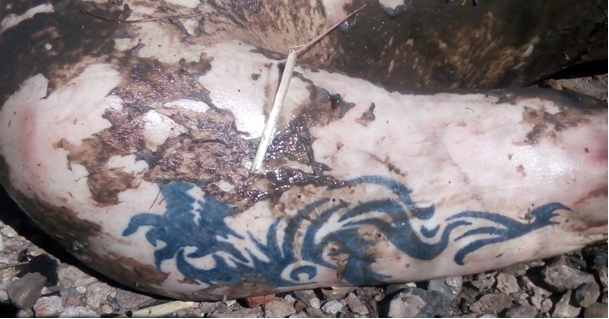 мужчина на вид 35-40 лет, рост 175 см, среднего телосложения, волосы рыжие, коротко стриженный, одетый в темно-синие спортивные штаны, на правом плече до локтя татуировки в виде дракона, на левом предплечье татуировка «H (1) Rh + ».