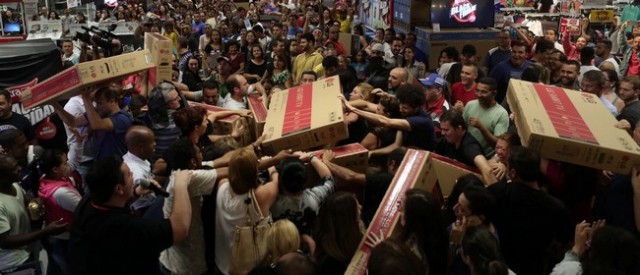 В «Черную пятницу» супермаркеты превращаются в поле боя за лучшие места в диких очередях. То и дело вспыхивают драки. «Богатые» и «счастливые» американцы набрасываются друг на друга, вырывая товар из рук. Давят друг друга тележками для вещей. В боях также участвуют и женщины.