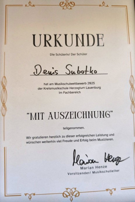 Константиновка снова громко заявила о себе на международной культурной арене. Наш земляк, воспитанник Константиновской школы искусств Денис Суботько, одержал яркую победу на двухтуровом международном конкурсе MUSIKSCHUL WETTBEWERB 2025, который проходил в Гамбурге (Германия).