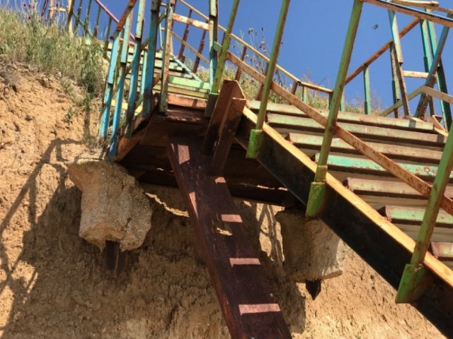 Старый спуск в аварийном состоянии. Передвигаться по нему запрещено. Об этом отдыхающих оповещают надписью на табличке у входа, однако доступ к спуску не закрыт. Поэтому наш народ, как это обычно бывает, прочитав предупреждение, смело спускается по ступенькам металлические сваи под которым просто сгнили.