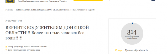 На сайте электронных петиций президенту Украины, 7 июня появилось обращение по восстановлению водоснабжения.