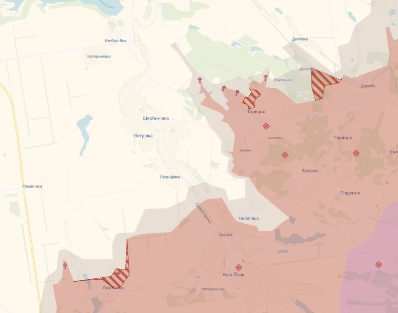 Сегодня ночью украинский аналитический паблик DeepState обновил карту боевых действий. Паблик сообщил, что противник захватил село Сухая Балка (Торецкая громада), а также продвинулся еще в одном селе Дачное и в самом Торецке.