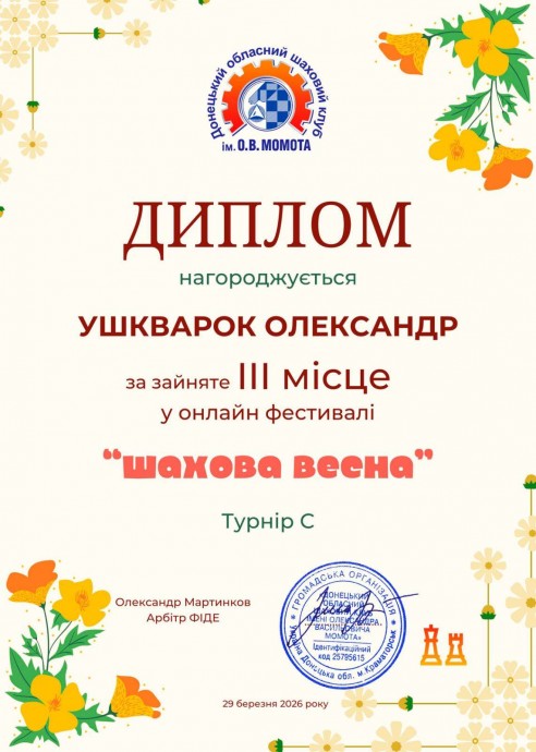 «В турнире C (шахматисты 3-го разряда) он завоевал почетное ІІІ место», — указывается в уведомлении.