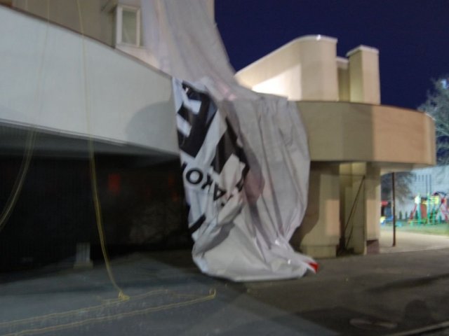 Этот баннер успел провисеть на фасаде лишь несколько часов.
