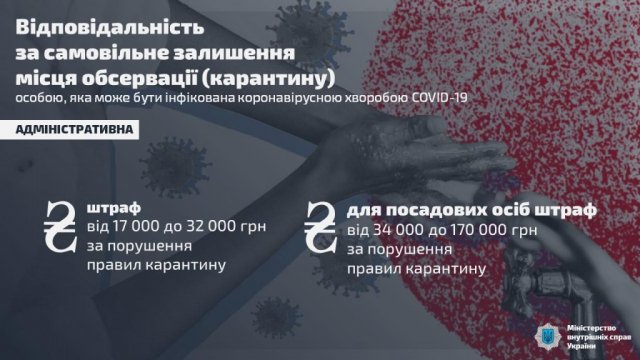 Кодекс Украины об административных правонарушениях дополнен ст. 44-3 «Нарушение правил карантина людей», согласно которой нарушение правил карантина людей, санитарно-гигиенических, санитарно-противоэпидемических правил и норм, предусмотренных Законом Украины «О защите населения от инфекционных болезней», другими актами законодательства, а также решений органов местного самоуправления по вопросам борьбы с инфекционными заболеваниями, влечет за собой наложение штрафа на граждан от одной до двух тысяч необлагаемых минимумов доходов граждан, на должностных лиц - в размере от двух до десяти тысяч неоп атковуваних минимумов доходов граждан.