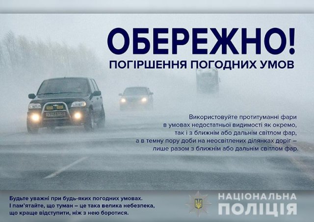 Обращаем внимание водителей на сложные погодные условия. Во время поездок в условиях недостаточной видимости (сильные дожди, туманы и т.п.) нужно быть максимально внимательными и осторожными. Пользуйтесь ремнями безопасности, соблюдайте безопасную дистанцию, не превышайте скорость, двигайтесь с включенным ближним светом фар или противотуманными фонарями.