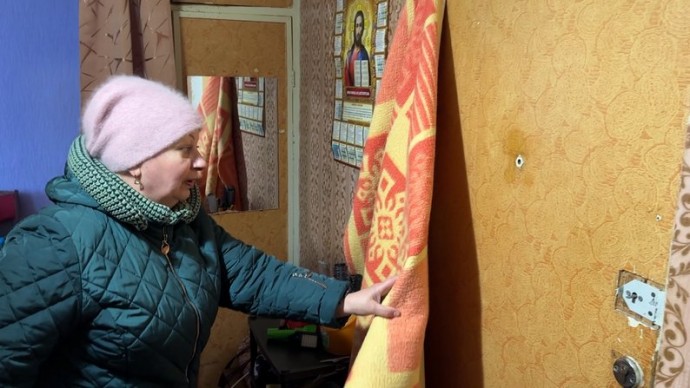 На дверях в квартире — теплое верблюжье одеяло, защищающее от сквозняков с подъезда. В нем выбиты российскими обстрелами окна.