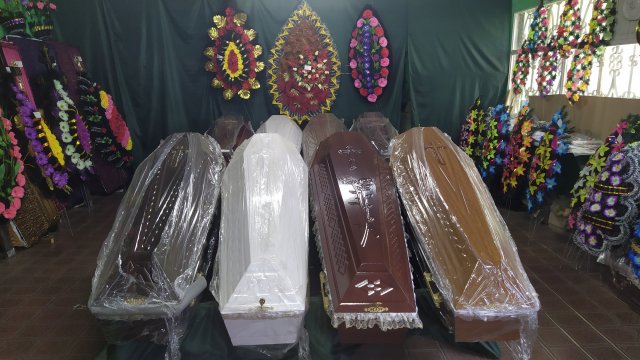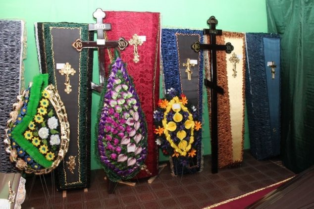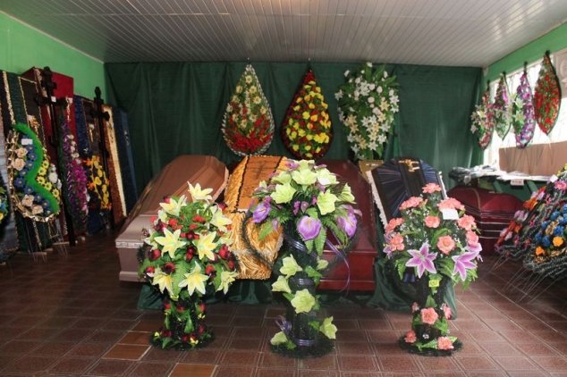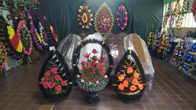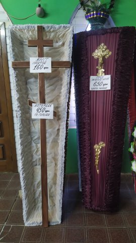 • Большой выбор гробов, крестов, венков, покрывал.