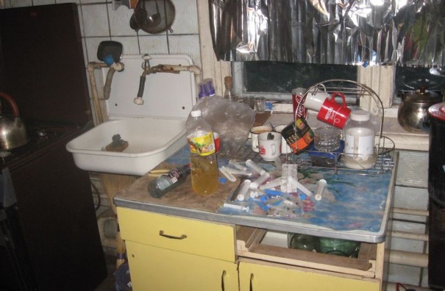 На момент визита правоохранителей до 49-летнего хозяина, в гостях находилось еще трое мужчин. Все они уже находились в состоянии наркотического опьянения. Во время осмотра дома, в комнате было обнаружено: пять одноразовых медицинских шприцев, металлическую посуду с остатками вещества коричневого цвета, 1 пустая бутылка вещества с надписью «Растворитель» и 1 бутылка с жидкостью коричневого цвета.
