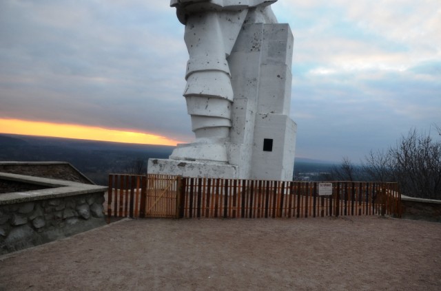 Вчера, направляясь к подножию памятника, я упёрся в забор, которым ограждена смотровая площадка. На заборе надпись: «ОСТОРОЖНО! Памятник в аварийном состоянии. Проход запрещён».