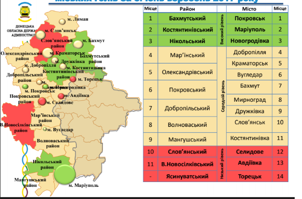 Самый низкий уровень социально-экономического развития зафиксирован в Словянском и Великоновоселковском районах. В тройке лидиров гороод Покровск, Мариуполь и Новогродовка, хуже всех развиваются Селидово, Авдеевка и Торецк.