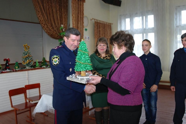 Каждому ребенку полицейские вручили сладкие подарки. А школьники подарили начальнику полиции трогательный подарок - новогоднюю елочку, сделанную своими руками.