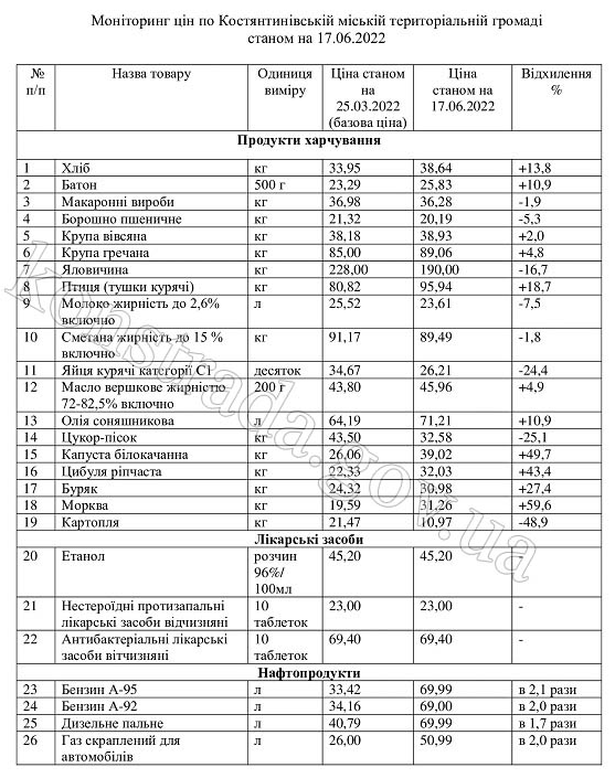 Мониторинг цен на товары первой необходимости в Константиновской городской территориальной громаде по состоянию на 17.06.2022
