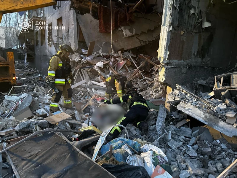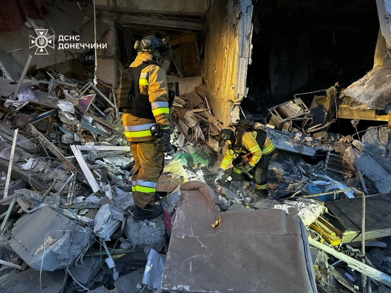 Як повідомляє Головне управління ДСНС України в Донецькій області, потрапляння припало до п'ятиповерхового будинку, де сталося руйнування перекриття між першим та другим поверхами.