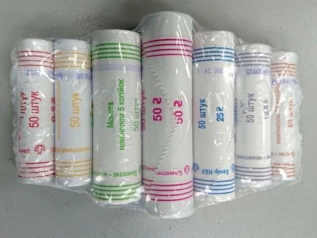 Комплект состоит из семи бумажных роликов с монетами номиналами 1, 2, 5, 10, 25, 50 копеек и 1 гривны. В каждом из них по 50 монет, они упакованы в термоусадочную пленку с бумажной этикеткой.