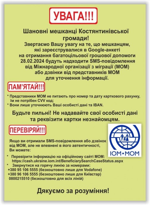 Обращаем Ваше внимание на то, что зарегистрировавшимся в Google-анкете жителям на получение многоцелевой денежной помощи 28.02.2024 будут поступать SMS-сообщения от Международной организации по миграции (МОМ) или звонки от представителей МОМ для уточнения информации.
