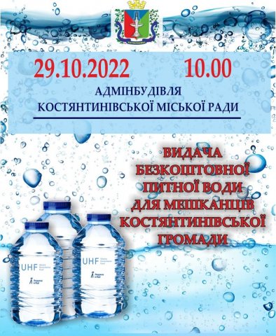 В субботу, 29 октября, раздача бесплатной питьевой воды будет проходить в 10:00 у здания Константиновского городского совета. Воду могут получить все желающие.